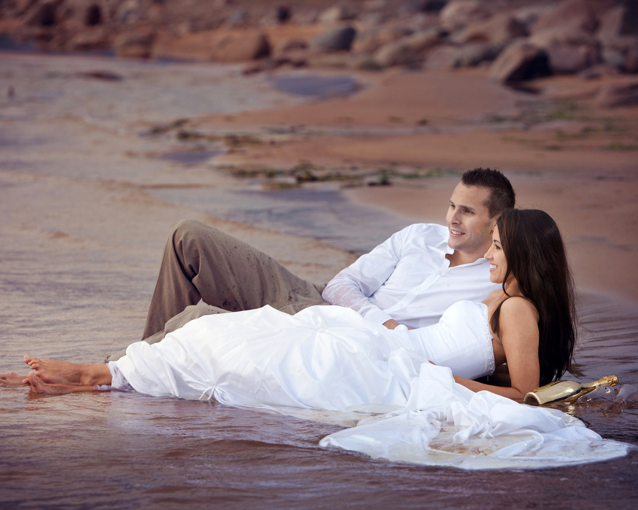 Назад к обои море, пляж, бокал, бутылка, босиком, пара, лежит, шампанское