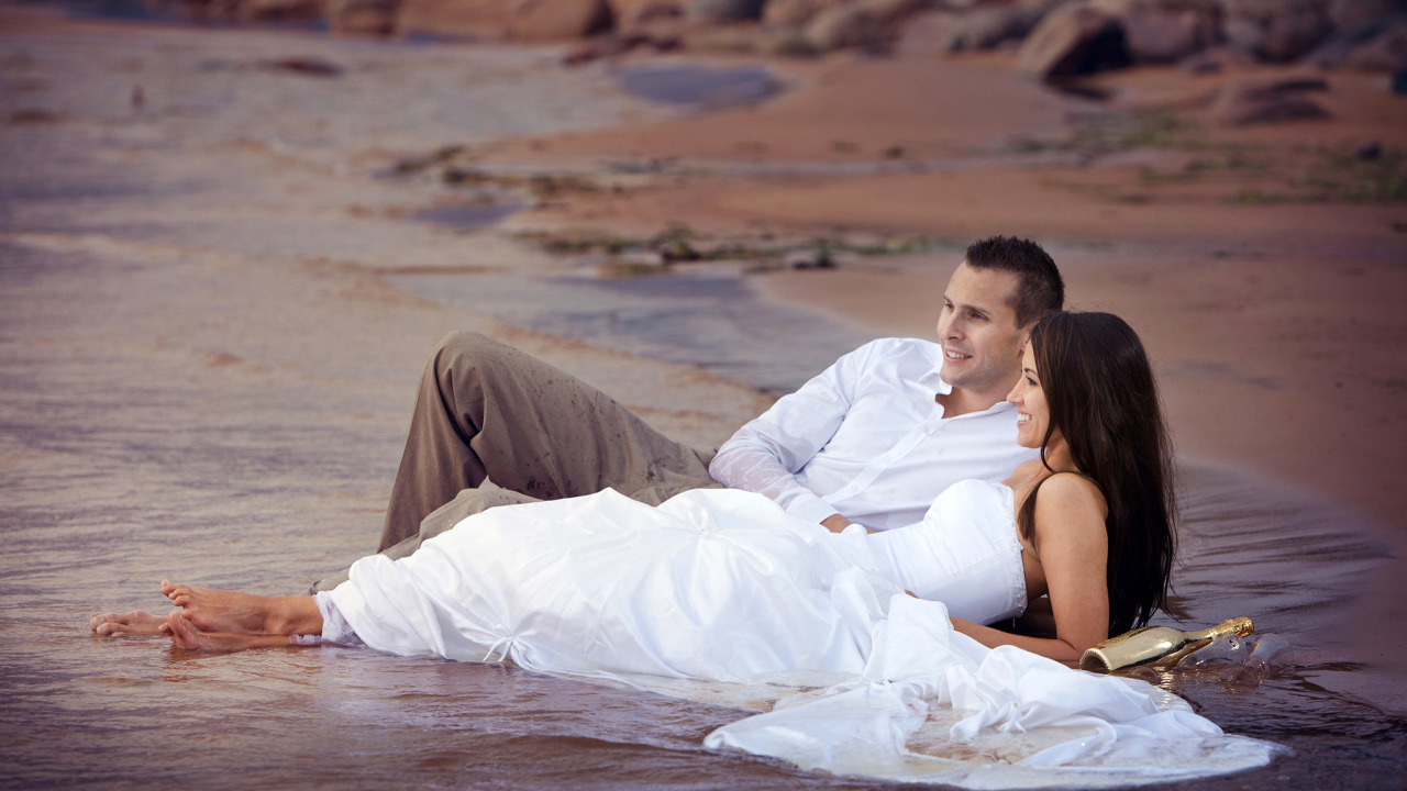 Назад к обои море, пляж, бокал, бутылка, босиком, пара, лежит, шампанское