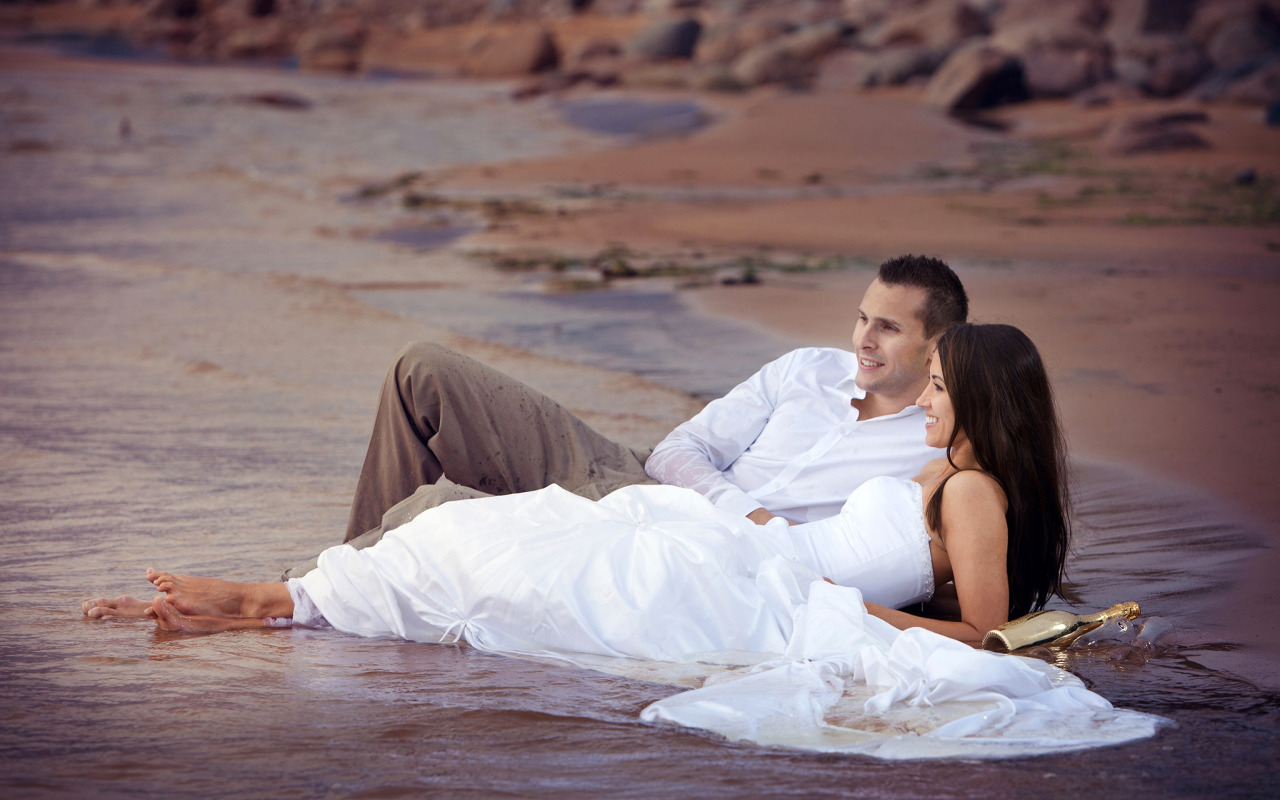 Назад к обои море, пляж, бокал, бутылка, босиком, пара, лежит, шампанское