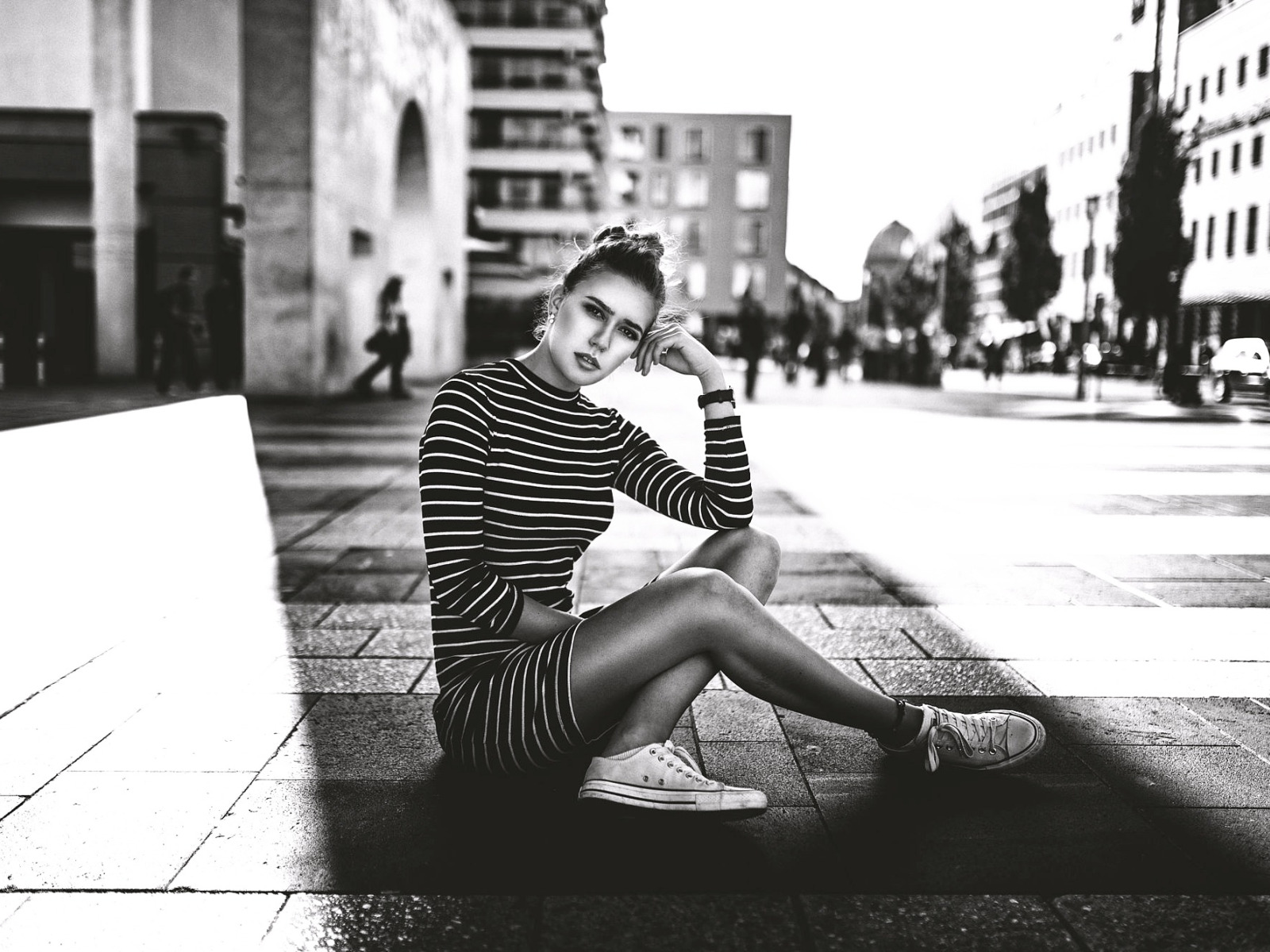 Назад к обои девушка, город, улица, ножки, сидит, Vanessa, Miro Hofmann, чб