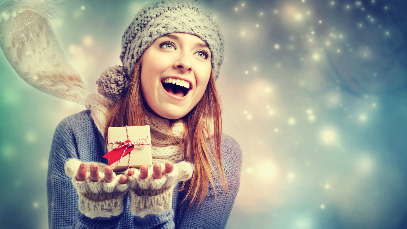 Назад к обои девушка, снег, радость, подарок, шапка, шарф, свитер, коробочка