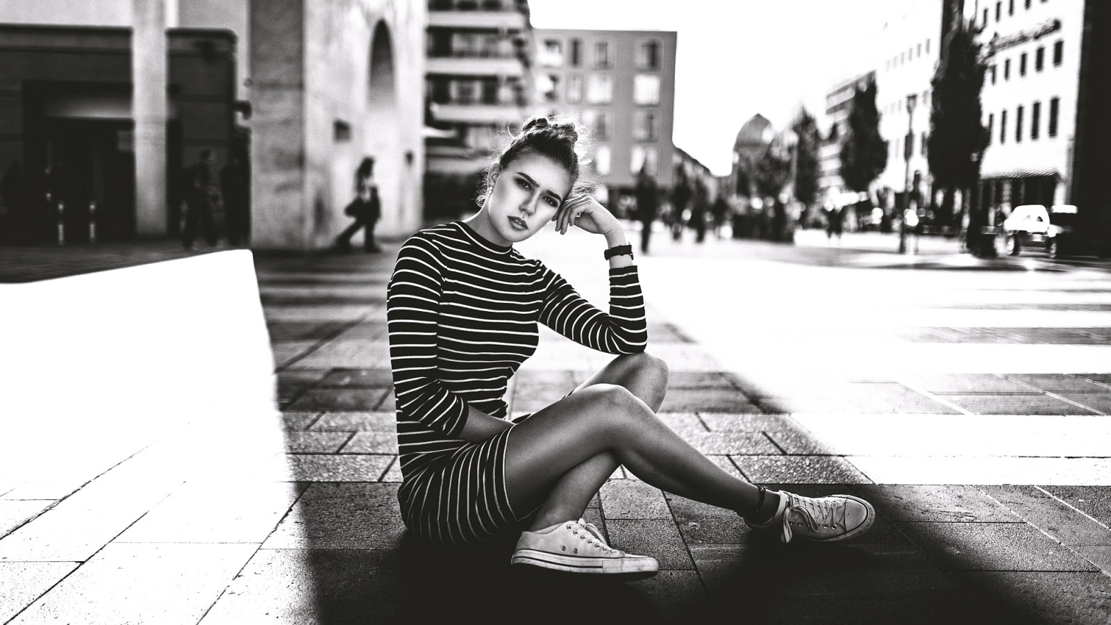 Назад к обои девушка, город, улица, ножки, сидит, Vanessa, Miro Hofmann, чб