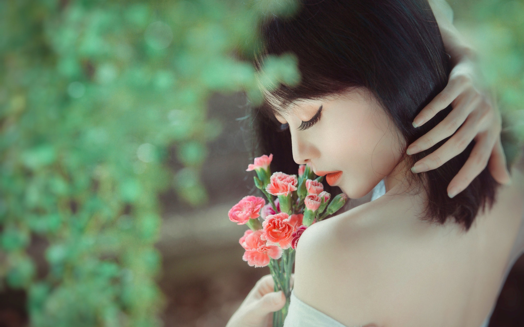 Назад к обои девушка, цветы, лицо, портрет, букет, азиатка, закрытые глаза