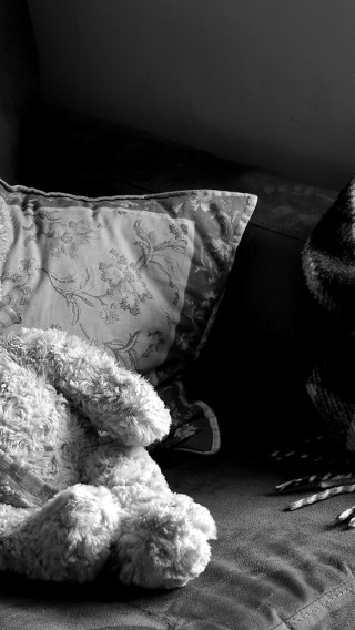 одиночество, диван, мишка, плюшевый, тоска, подушка.одеяло, чёрнобелое