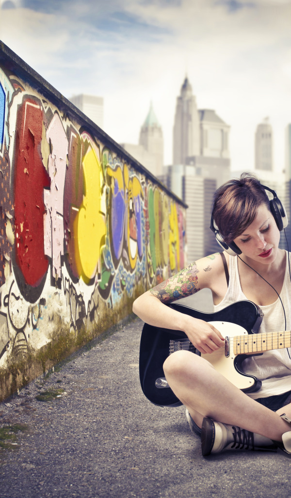 Назад к обои небо, асфальт, девушка, город, стена, граффити, гитара, наушники