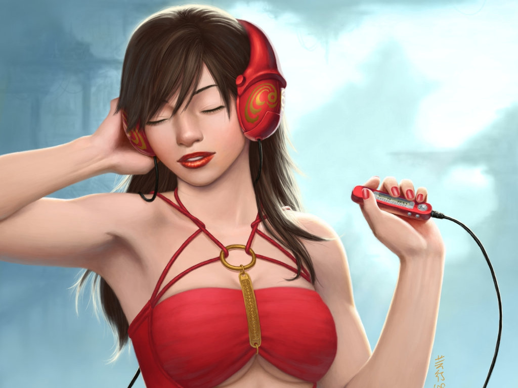Назад к обои девушка, музыка, рисунок, наушники, арт, плеер, иероглифы