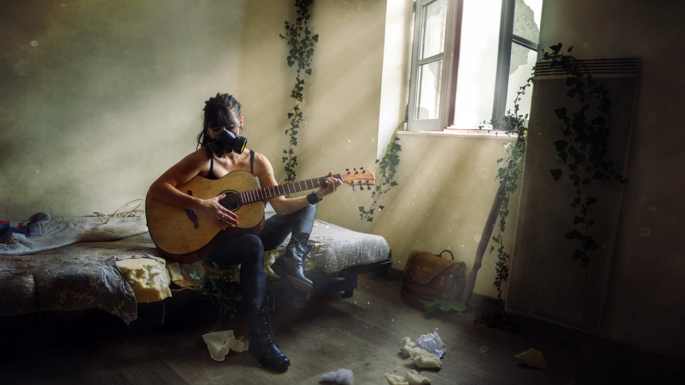 девушка, гитара, противогаз