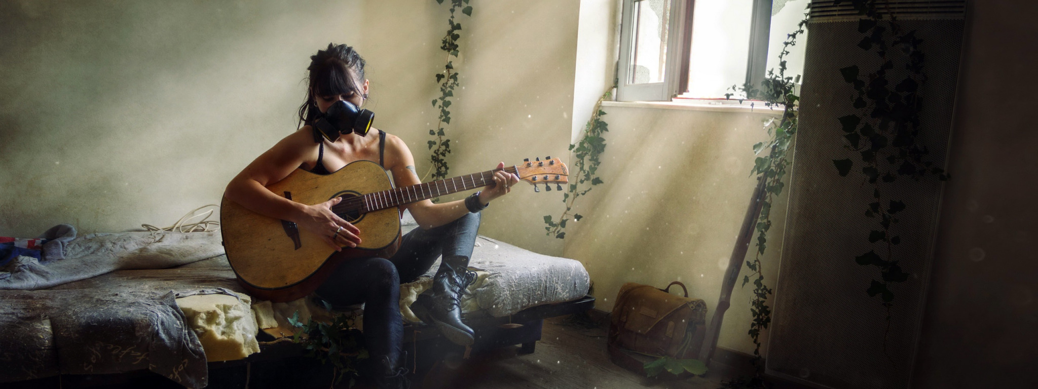 девушка, гитара, противогаз