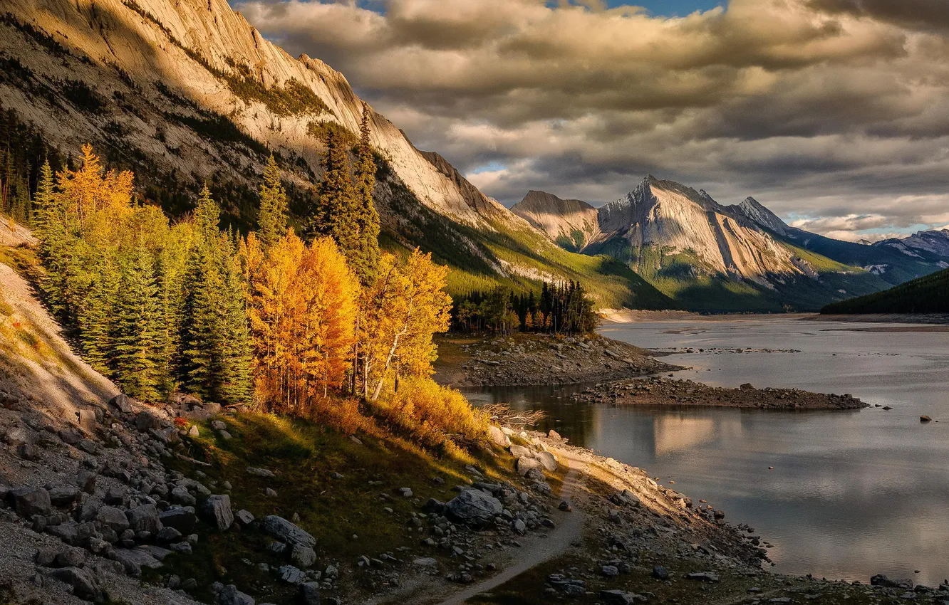 Осень, деревья, закат, горы, природа, озеро, скалы обои на телефон (фото, картинки)