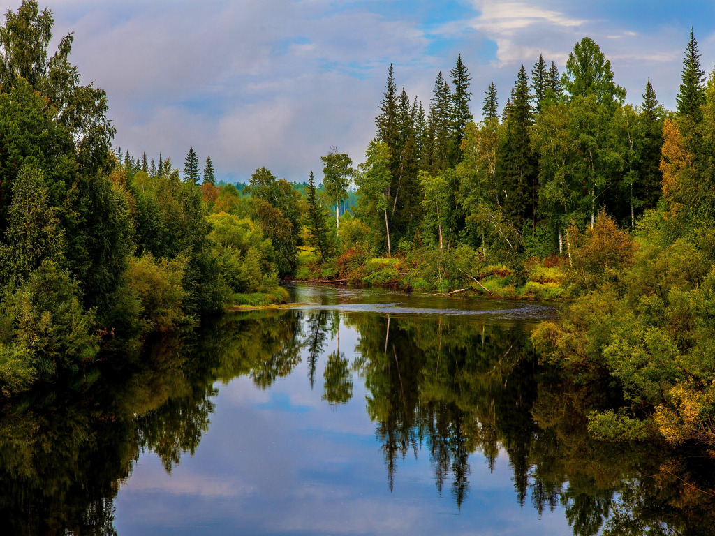 Назад к обои лес, небо, облака, деревья, пейзаж, озеро, отражение, река