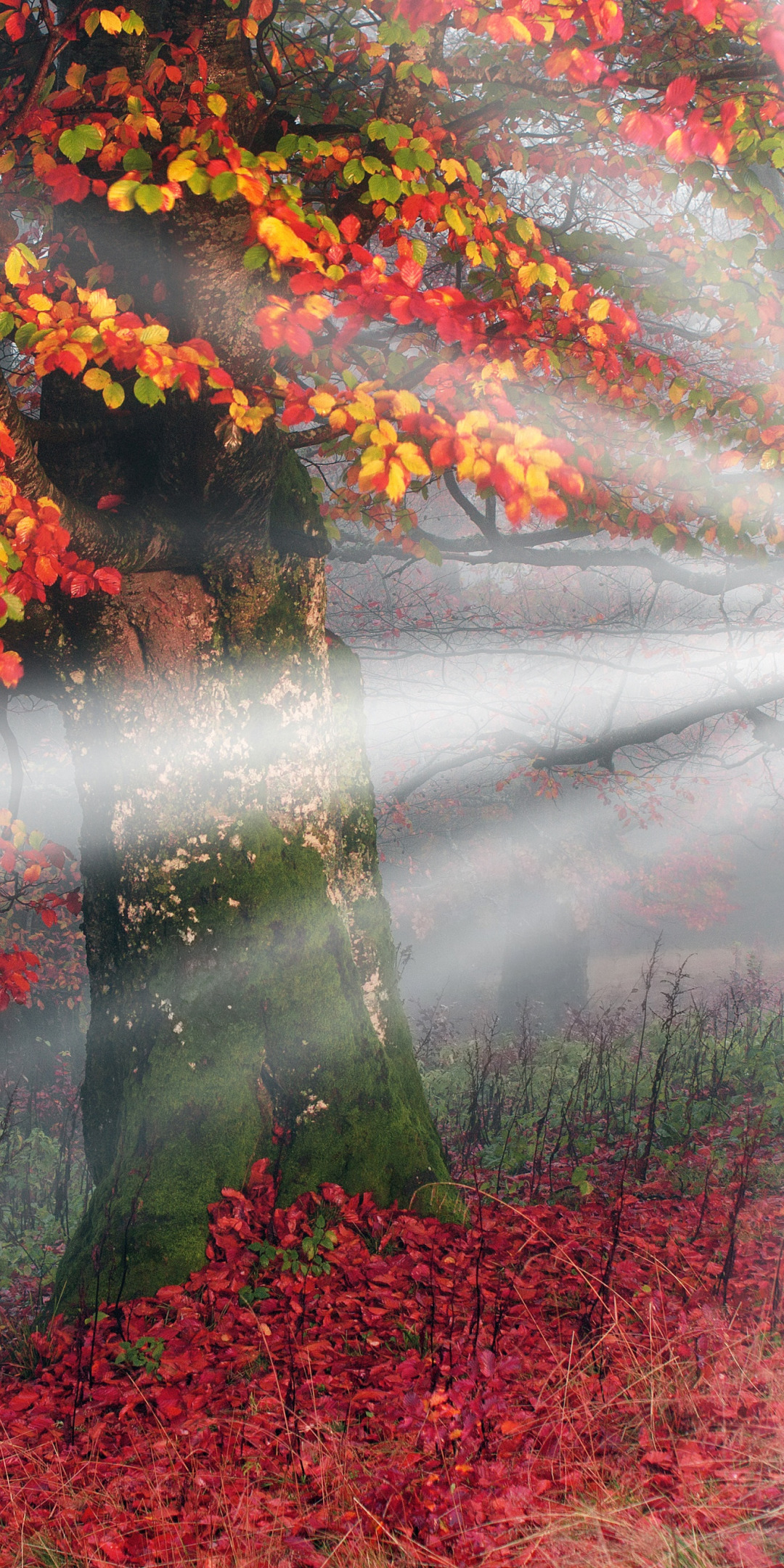 осень, лес, листья, деревья, желтый, красный, туман, утро
