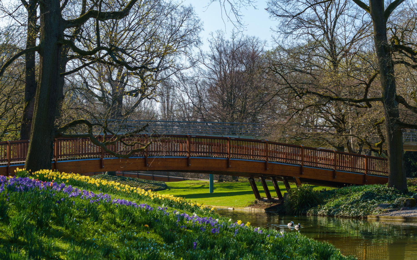 солнце, деревья, цветы, мост, пруд, парк, утки, весна