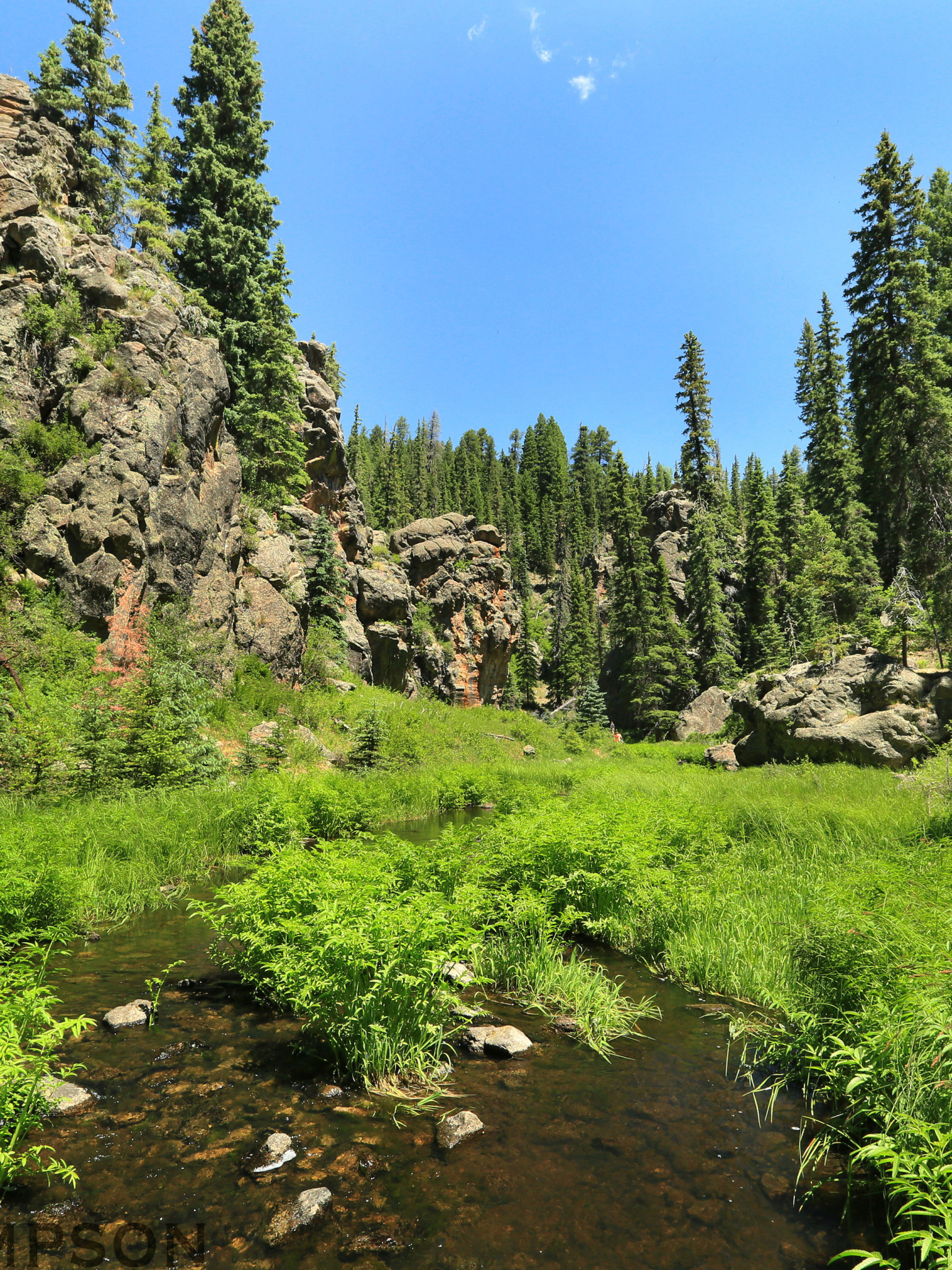 лес, лето, трава, солнце, деревья, ручей, камни, скалы