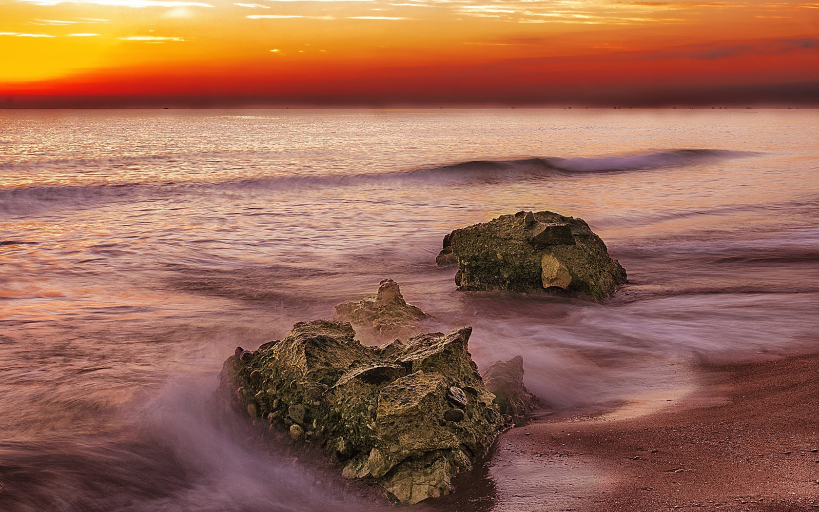 Назад к обои море, небо, облака, камни, берег, вечер, отлив, зарево