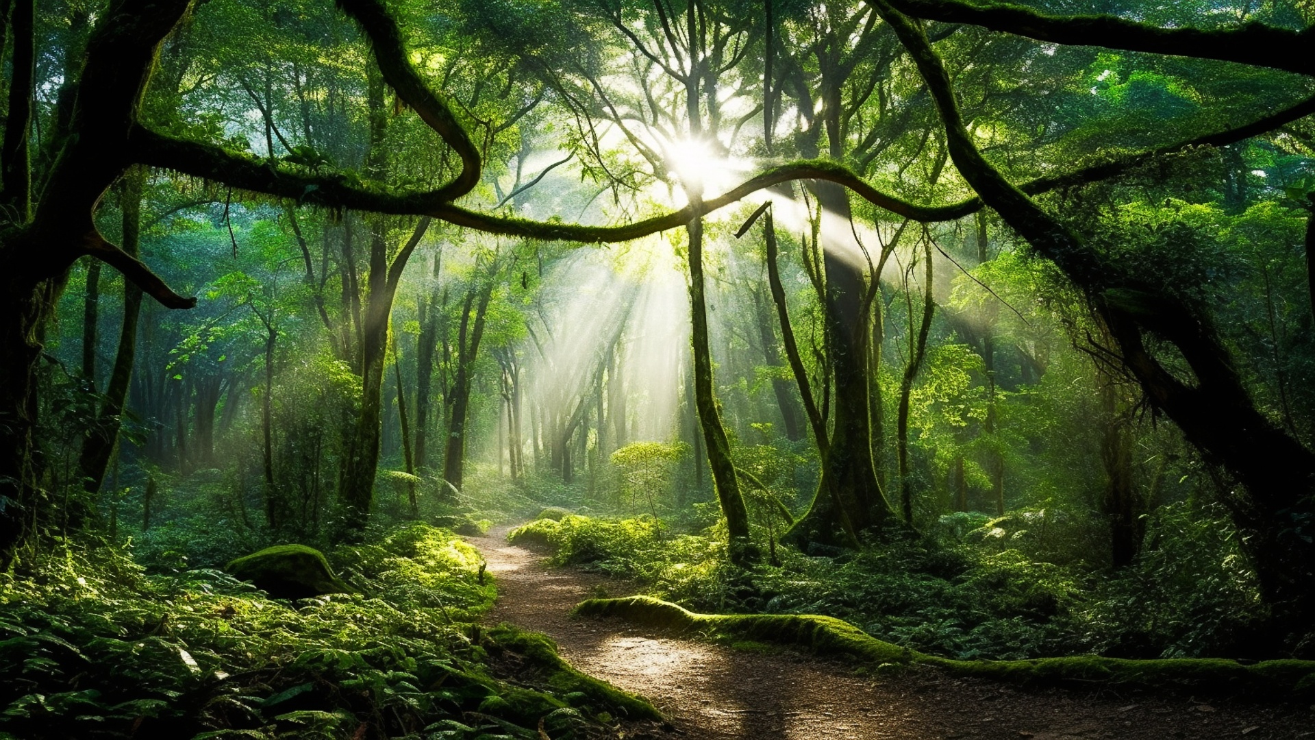green, forest, trees, art, sunlight, branch, path, sun rays