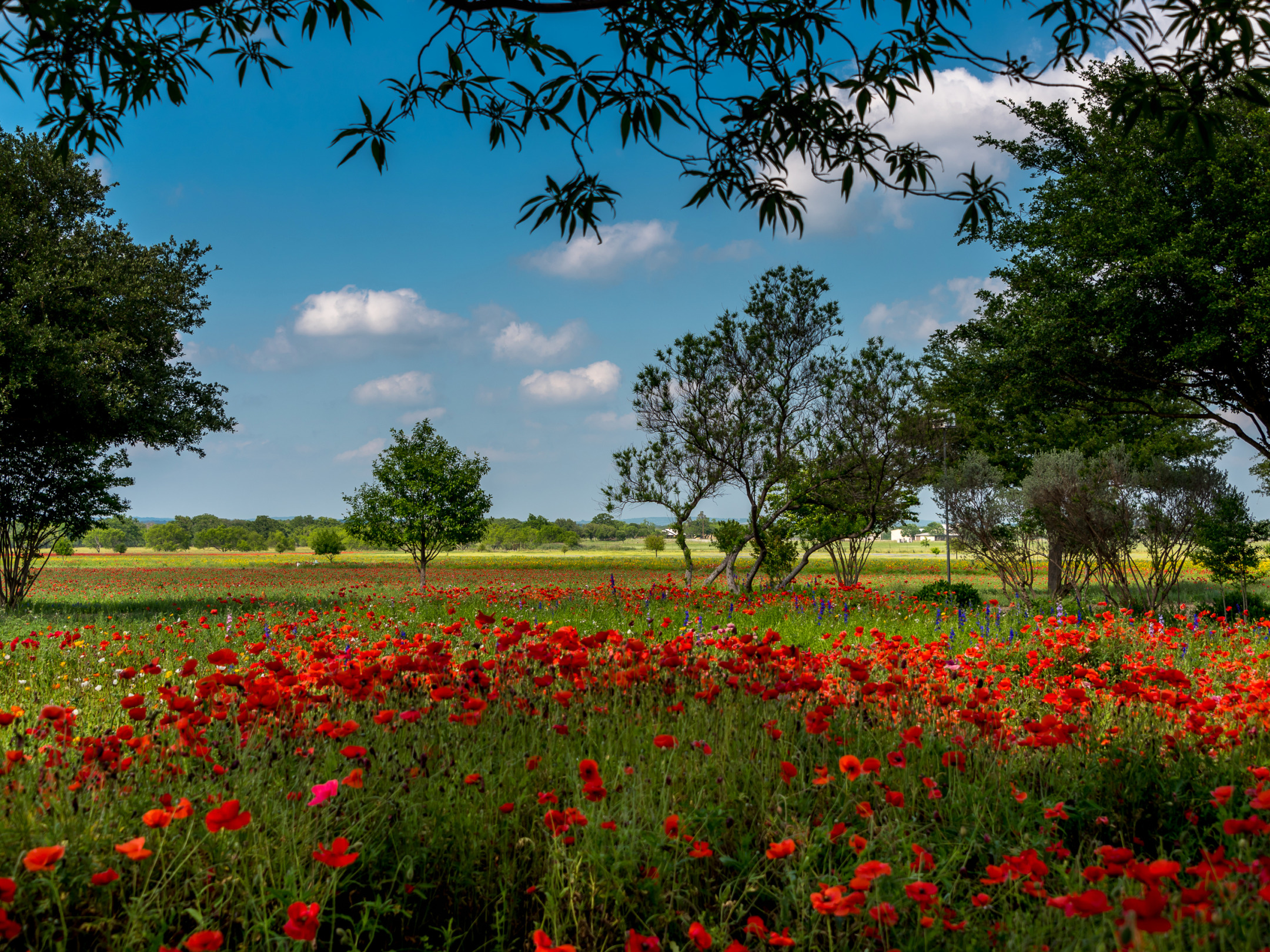 поле, лето, трава, деревья, цветы, красный, маки, США