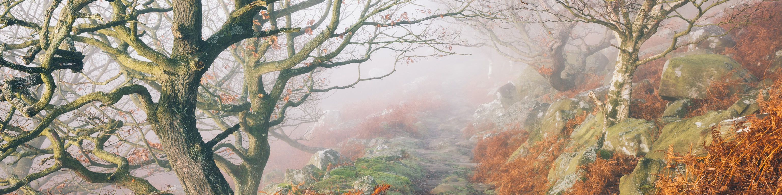 осень, лес, деревья, ветки, туман, парк, камни, утро