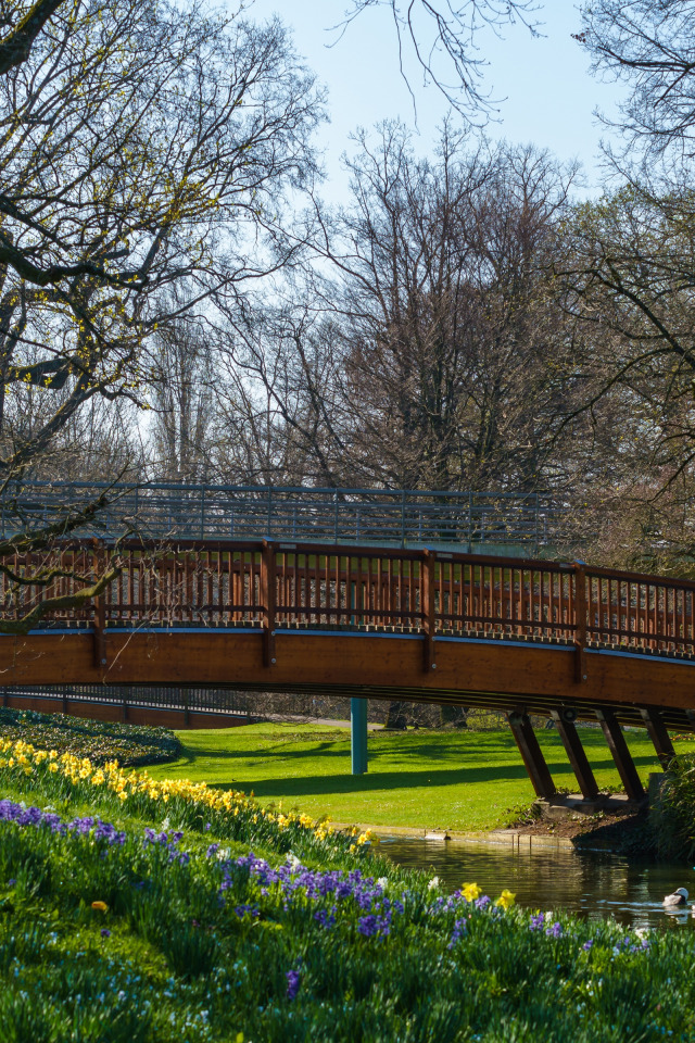 солнце, деревья, цветы, мост, пруд, парк, утки, весна