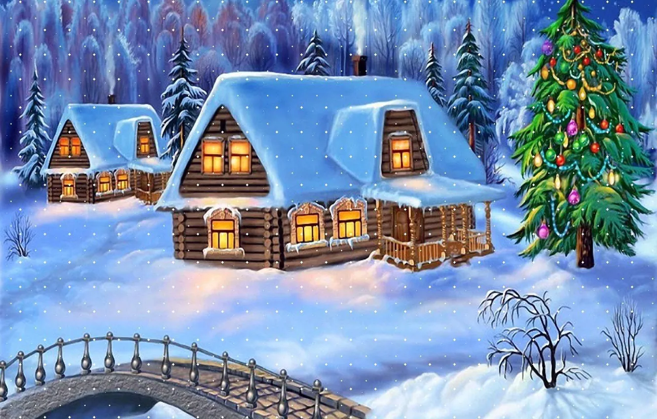 Зима, снег, елка, домик, мостик обои на телефон (фото, картинки)