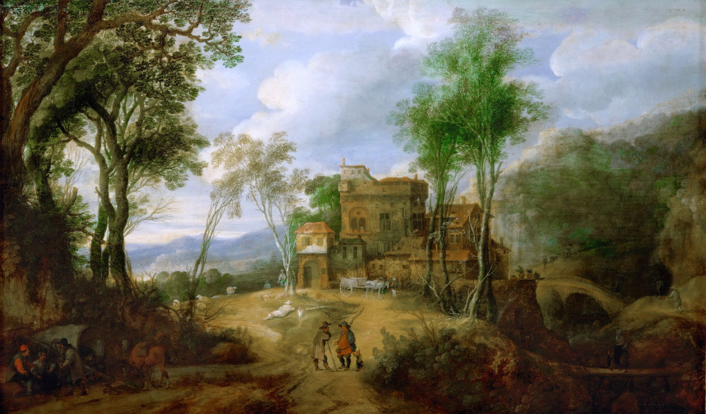 деревья, пейзаж, горы, мост, человек, дома, картина, Mountain Landscape with Castle