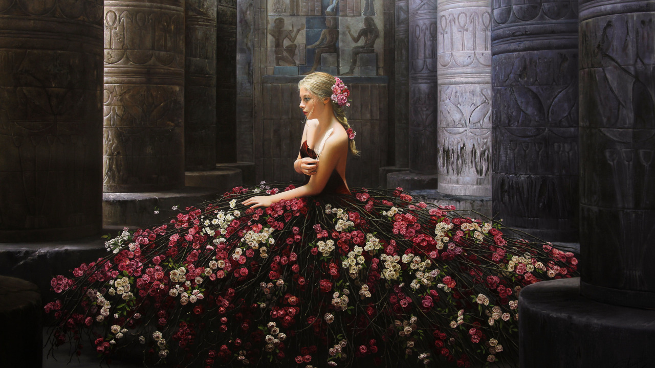 Назад к обои девушка, цветы, поза, модель, розы, платье, колонны, живопись