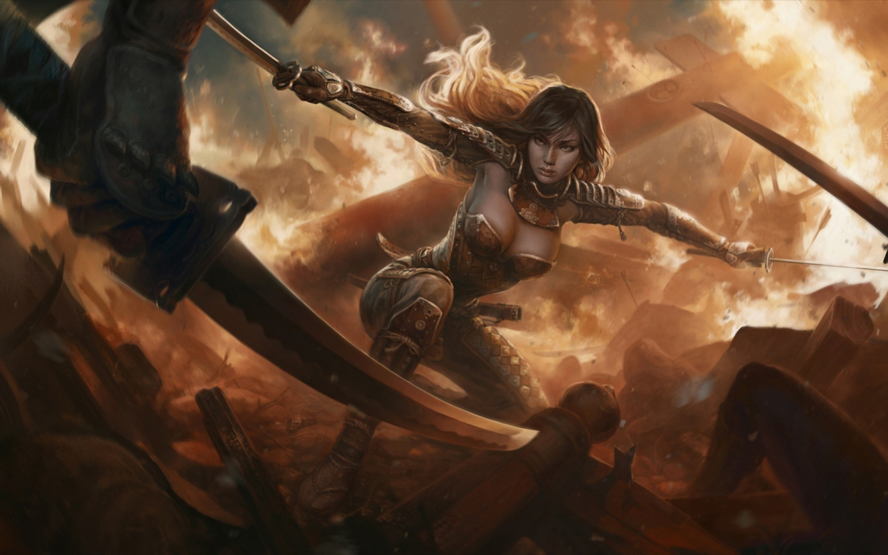 Назад к обои девушка, пламя, доспехи, сражение, воительница, клинок