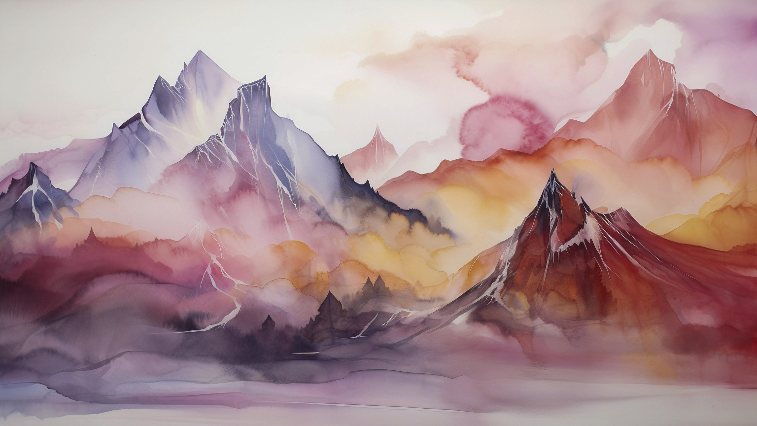 Назад к обои небо, горы, скалы, вершины, размытие, склон, имитация акварели, имитация живописи