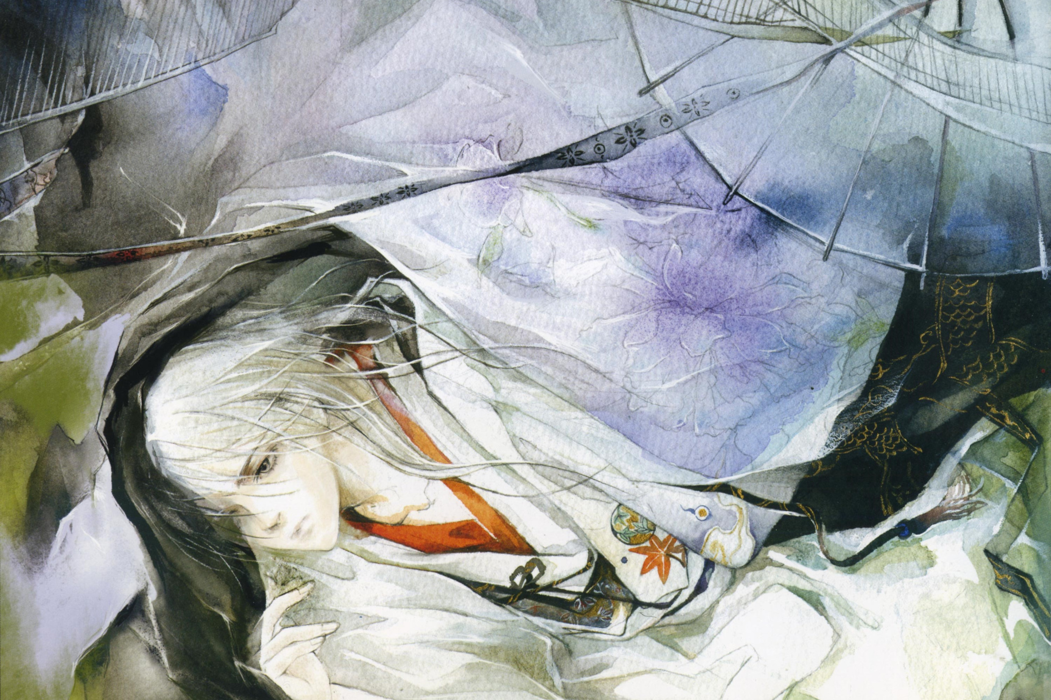 Назад к обои зонт, акварель, парень, японская одежда, art, Eno, русунок, длинные белые волосы