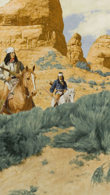 Назад к обои конь, рисунок, всадник, ружьё, индеец