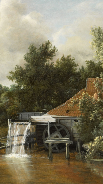Назад к обои пейзаж, масло, картина, водяная мельница, Мейндерт Хоббема