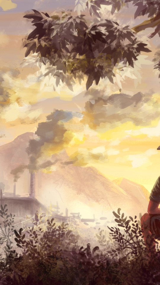 Назад к обои деревья, настроение, завод, дым, рисунок, мальчик, арт, постройки