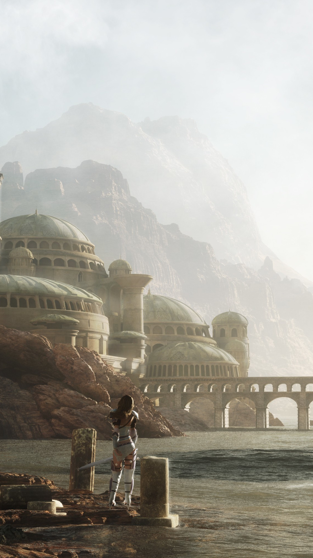 Назад к обои девушка, пейзаж, мост, город, река, скалы, арка, рендер