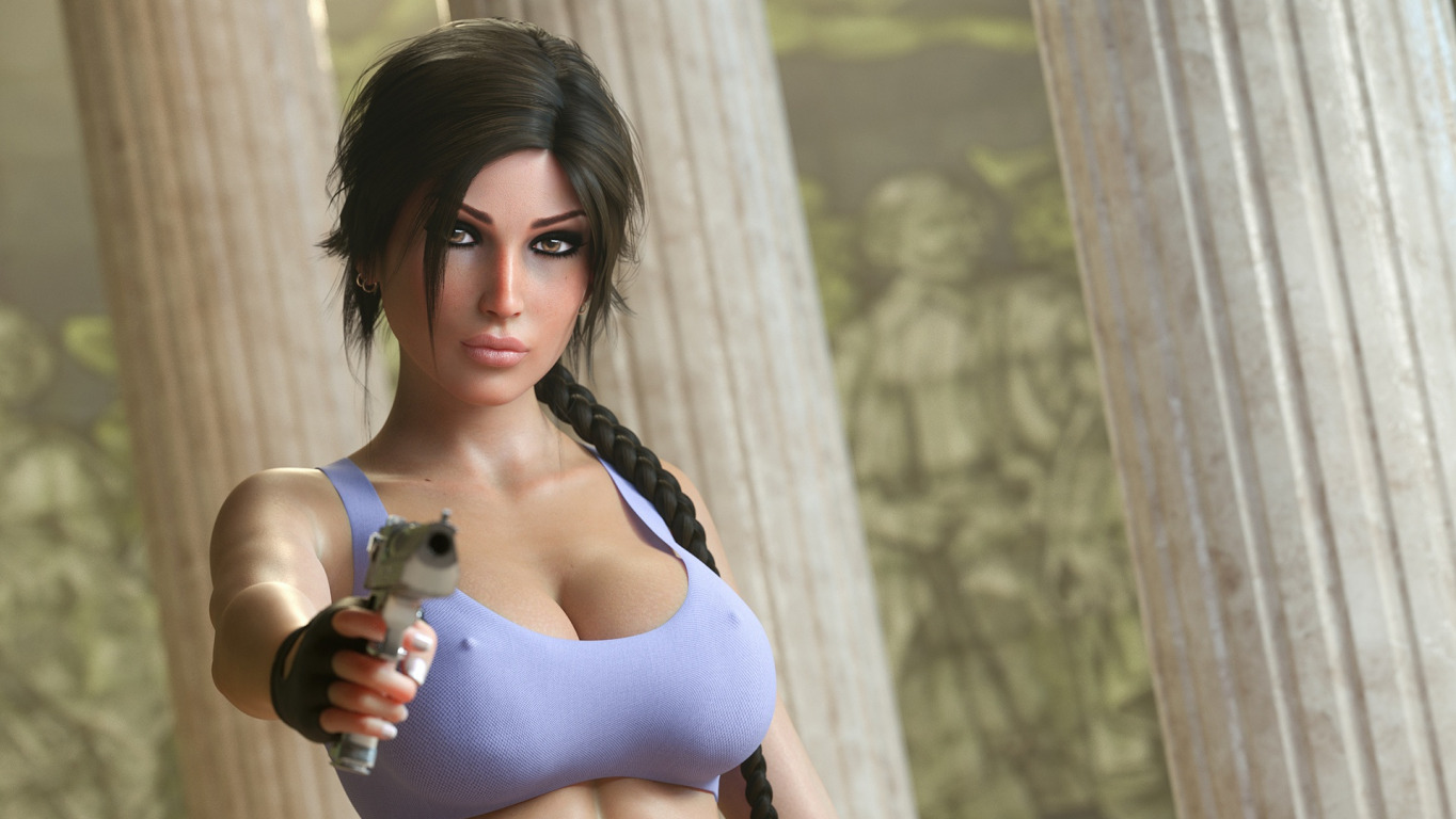 Назад к обои грудь, взгляд, девушка, рендеринг, пистолет, Tomb Raider, Lara Croft