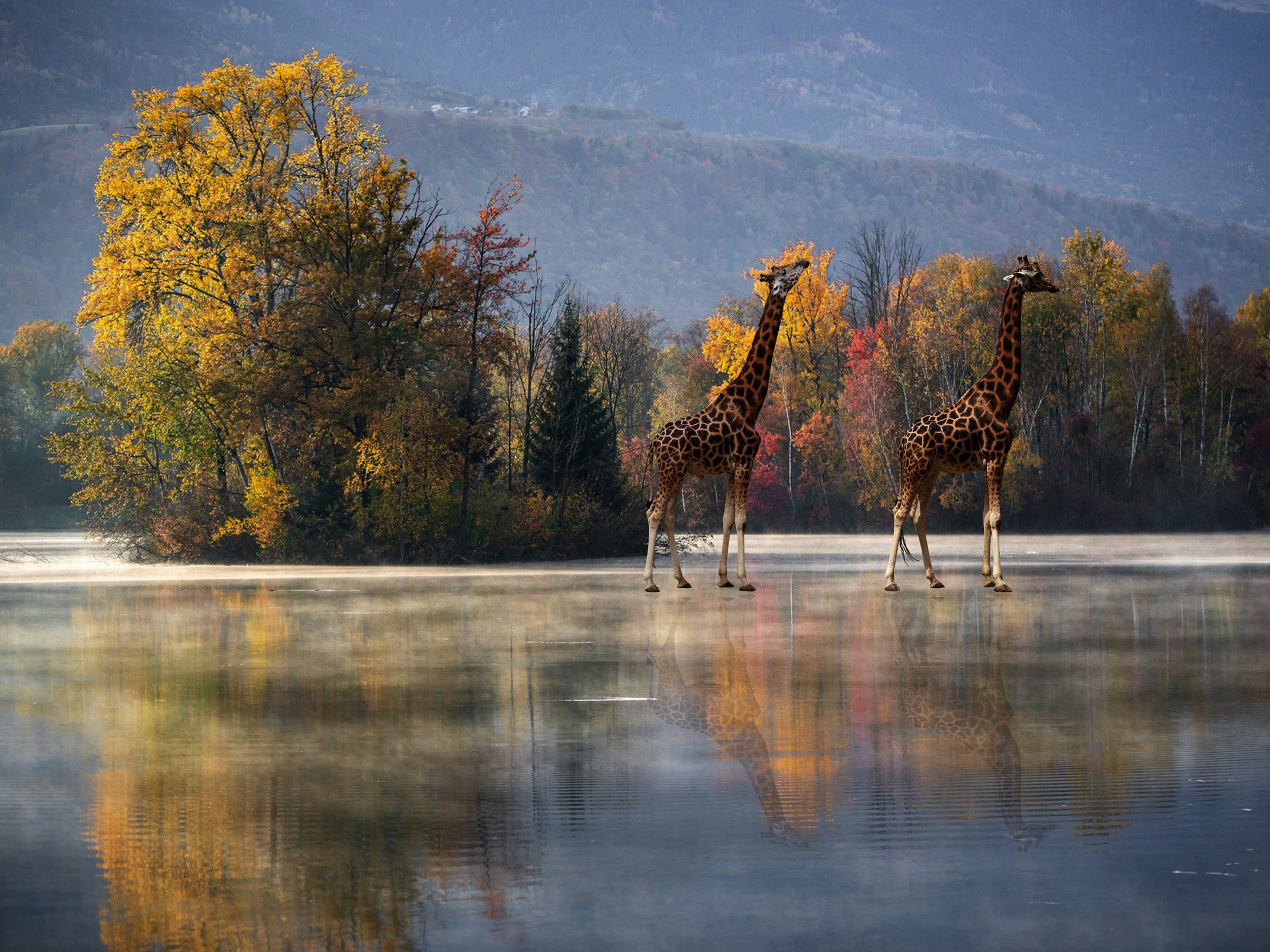 Назад к обои осень, деревья, отражение, рендеринг, жираф, водоем