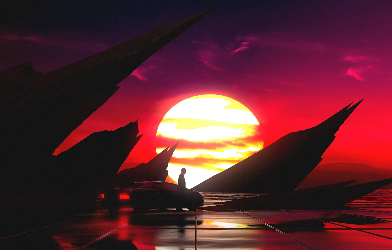 Машина, авто, солнце, закат, стиль, музыка, человек, силуэт обои на телефон (фото, картинки)