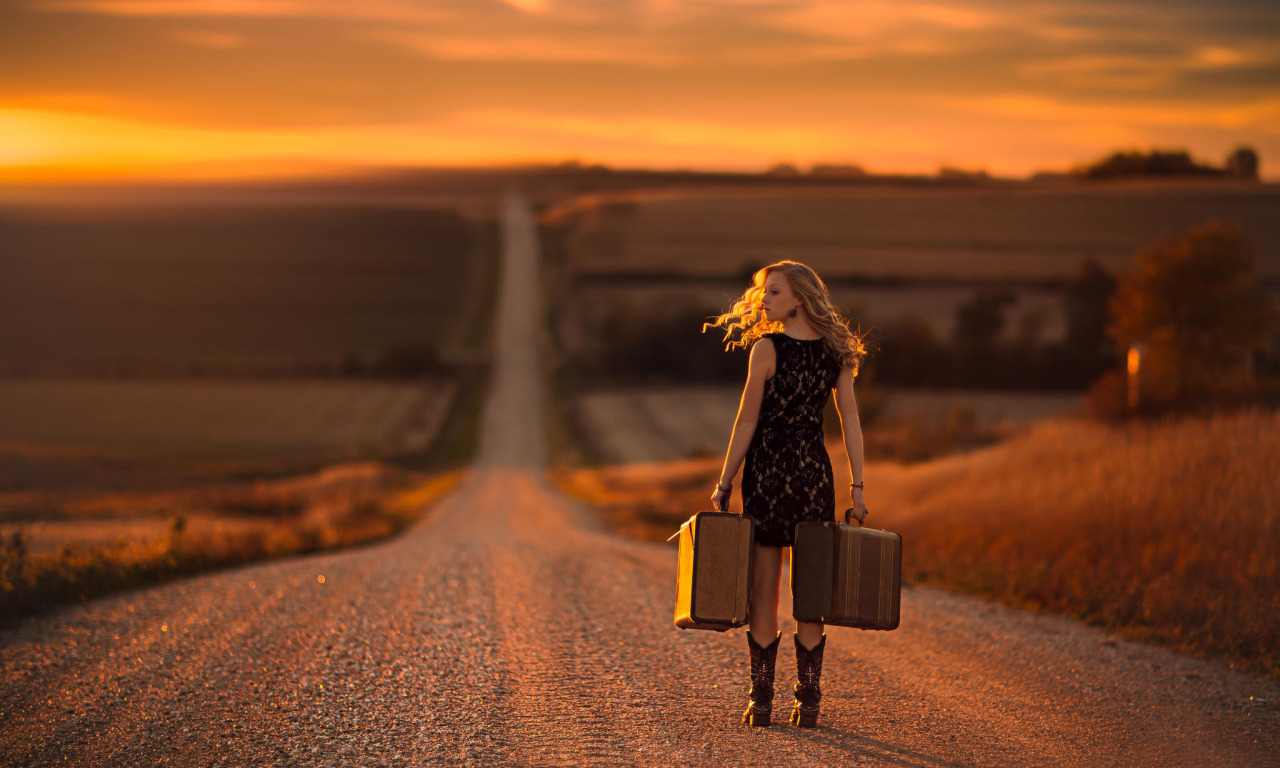 Назад к обои девушка, путь, дорога.чемоданы