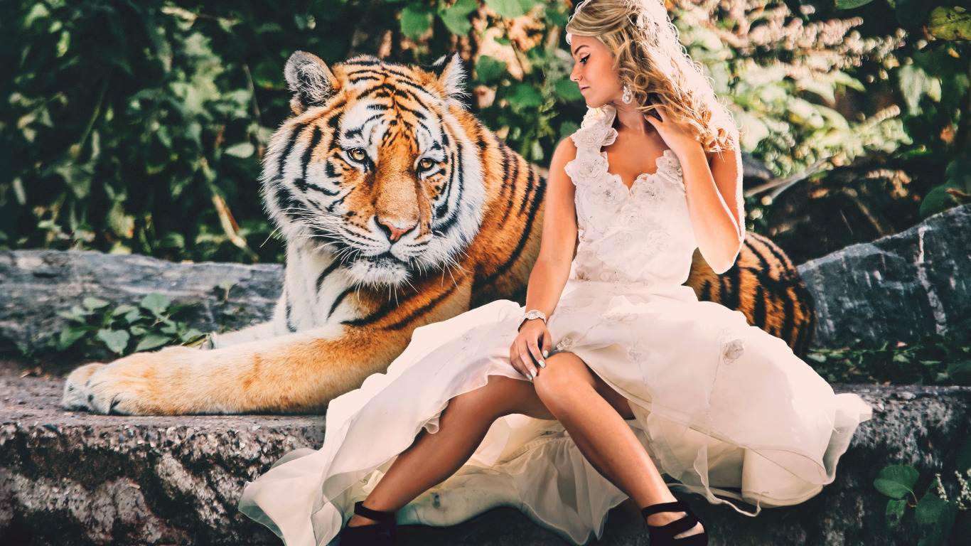 Назад к обои взгляд, морда, девушка, природа, тигр, поза, камни, друг