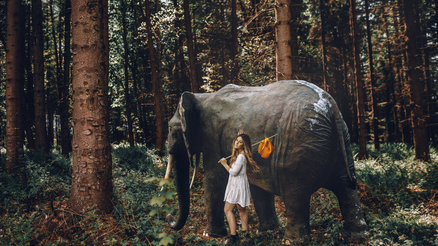 лес, девушка, слон