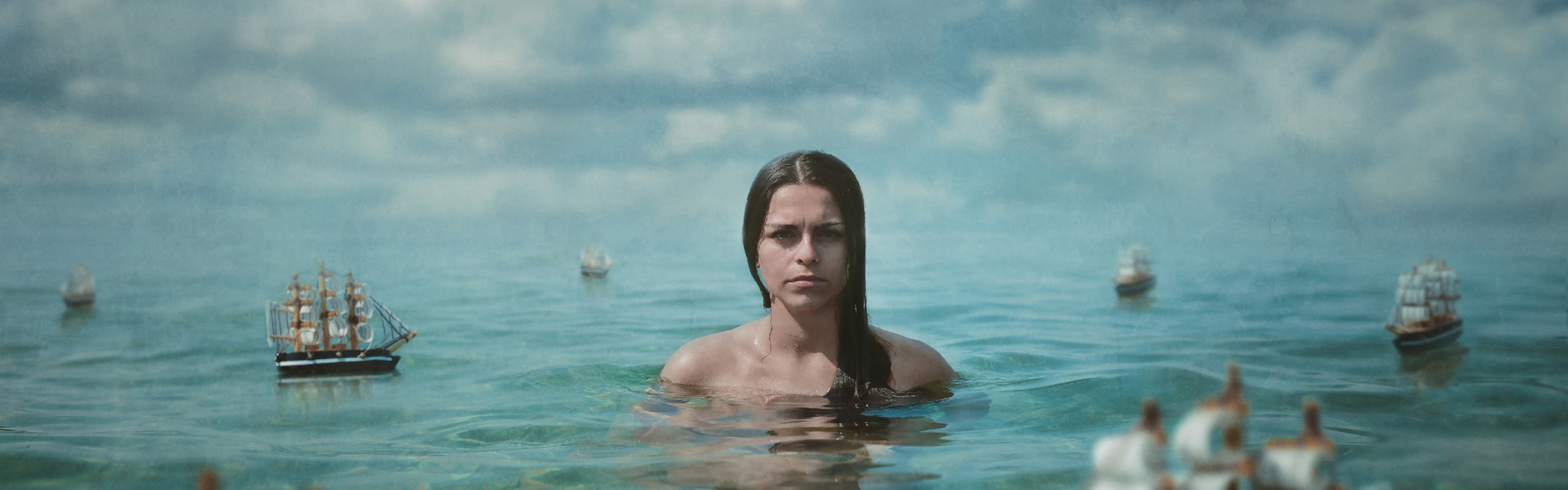 море, вода, девушка, облака, парусник, ситуация, текстура, кораблик