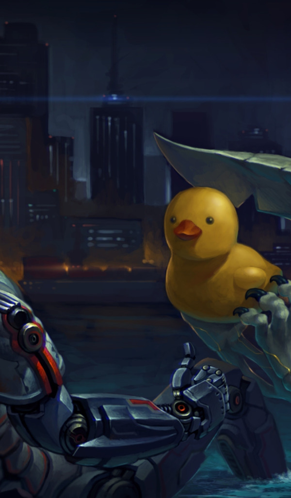 Назад к обои город, озеро, робот, монстр, юмор, арт, залив, уточка