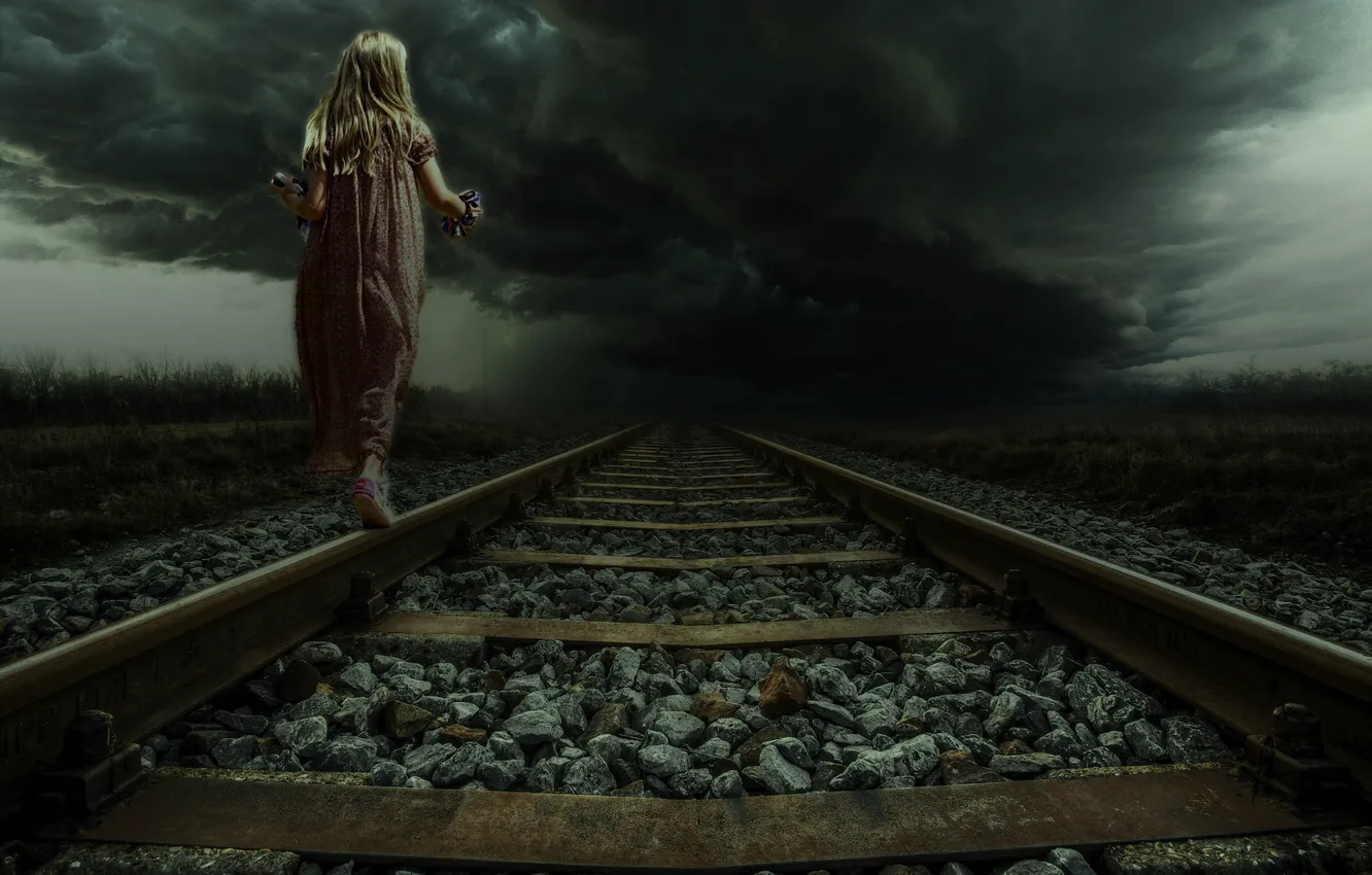 Дорога, гроза, облака, пейзаж, тучи, путь, рельсы, арт обои на телефон (фото, картинки)