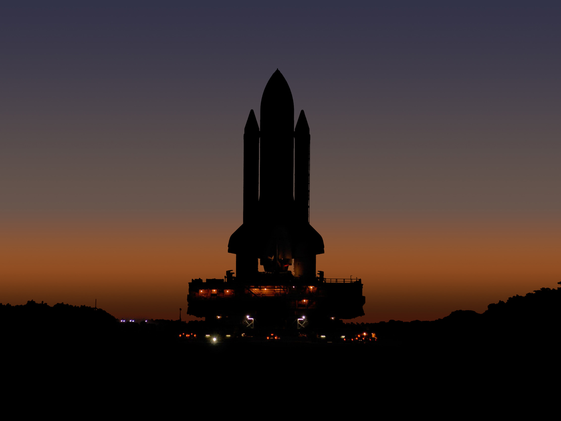 Назад к обои lights, NASA, sunset, shuttle, silhouette, Launch Platform