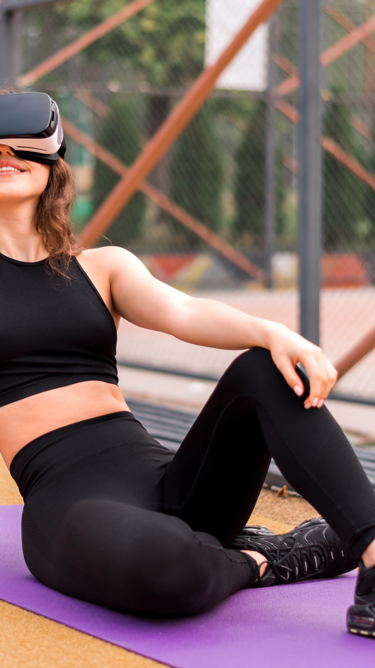 Назад к обои woman, smiling, yoga, Tracksuit, vr-headset