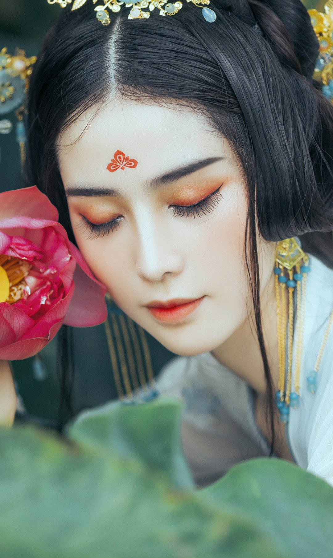 белый, листья, девушка, украшения, цветы, красный, природа, лицо