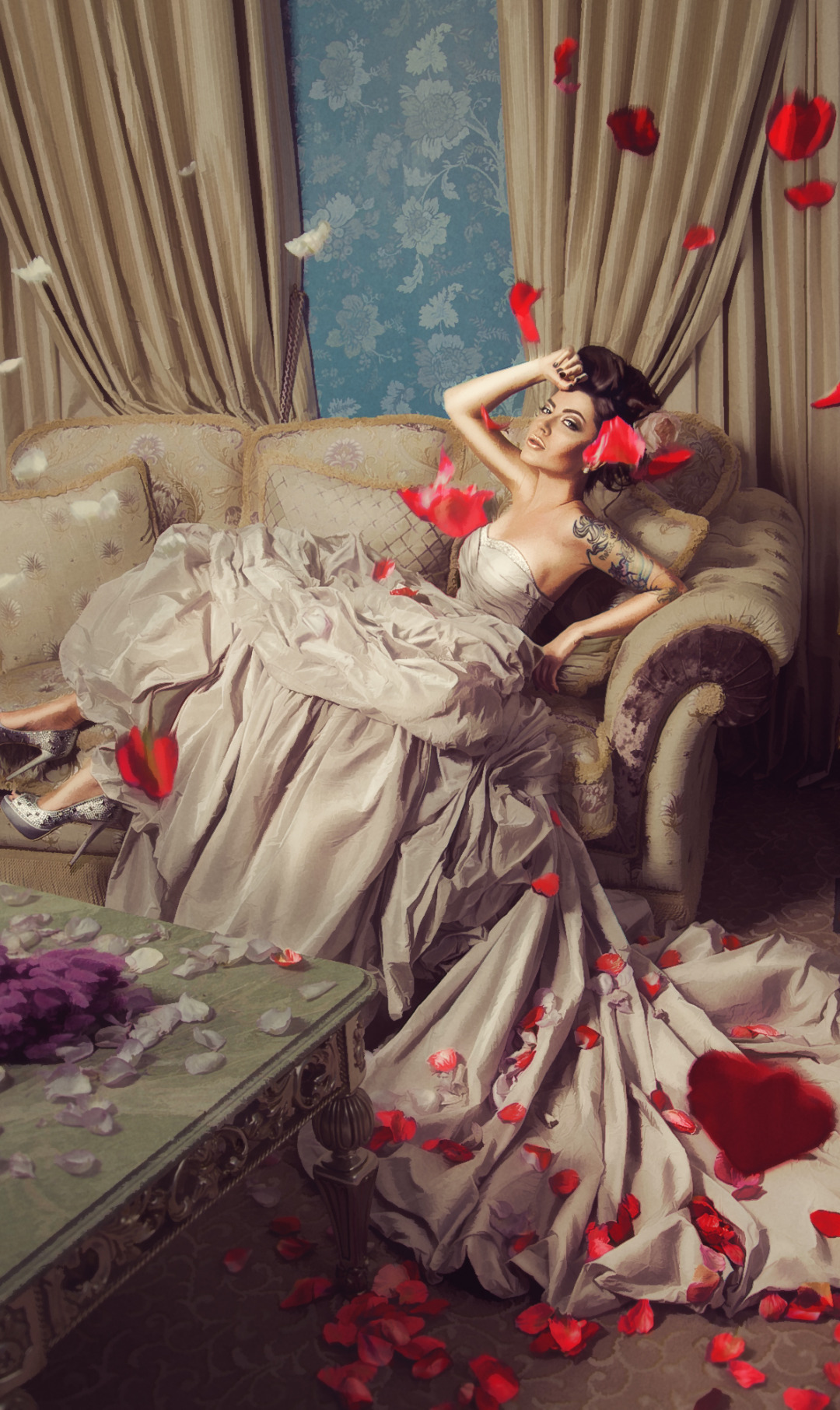 Назад к обои девушка, цветы, лепестки, платье, Max Twain