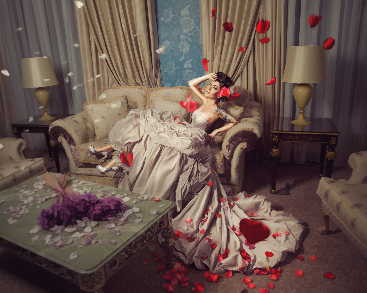 девушка, цветы, лепестки, платье, Max Twain