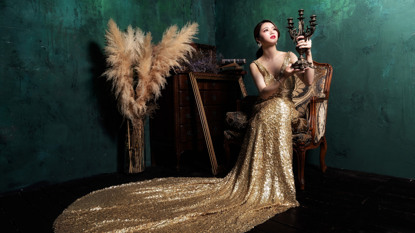 Назад к обои взгляд, девушка, поза, зеленый, темнота, стиль, темный фон, комната