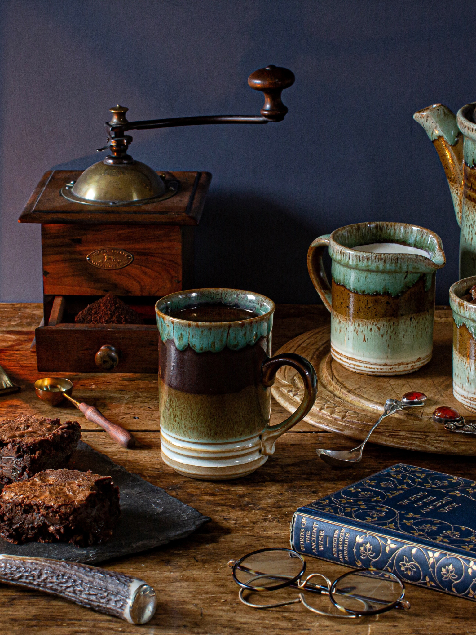 Назад к обои стиль, кофе, очки, пирог, фонари, нож, кружка, книга