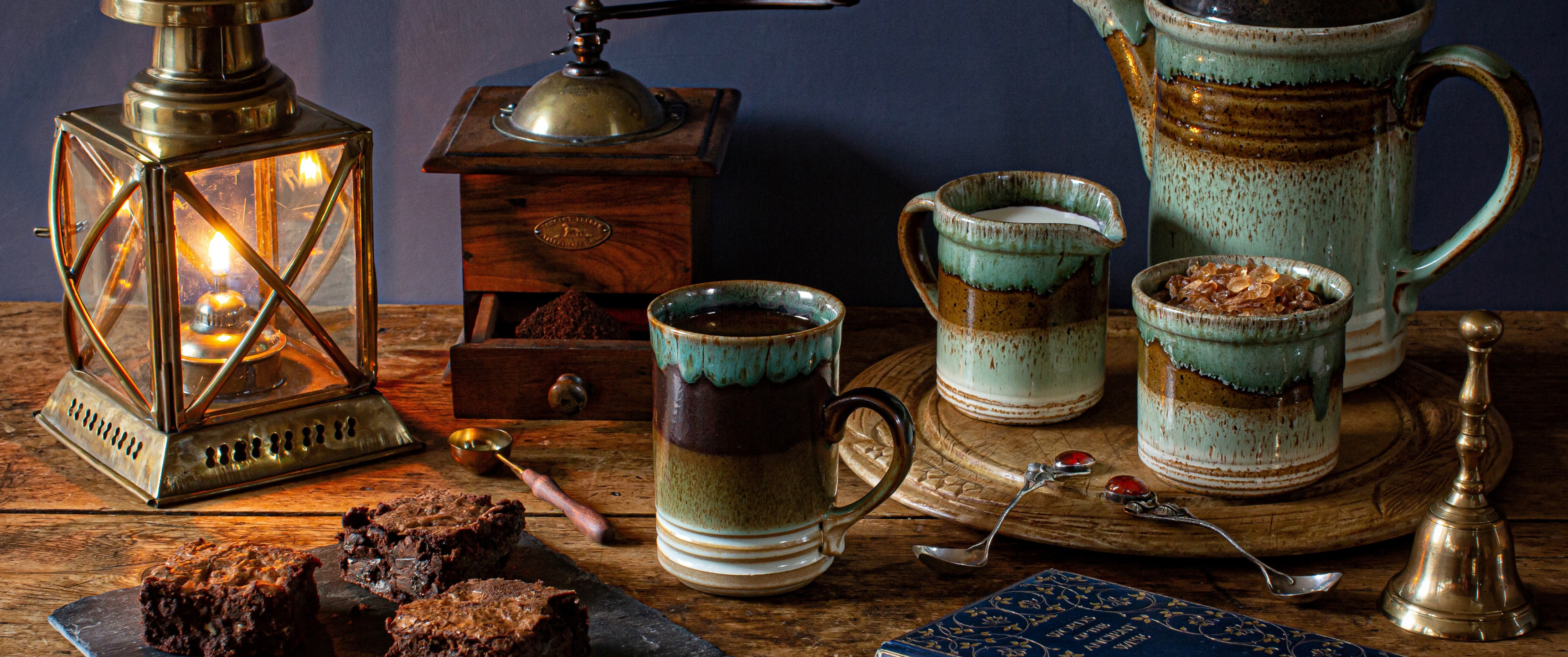 Назад к обои стиль, кофе, очки, пирог, фонари, нож, кружка, книга